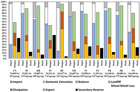Since its introduction by Hashimoto et al. [23], the classification of secondary resources has been applied to materials such as copper [24,25,26], aluminum [27], and zinc [28]. This study extends its application to lead, bridging the gap between historical lead accumulation in society and the environment and its future recovery potential. Rather than analyzing lead production trends, we focus explicitly on lead consumption dynamics and secondary resource potential by selecting eleven major economies that collectively accounted for over 70% of global refined lead consumption between 1950 and 2018. We then developed a comprehensive material flow model for these selected economies, integrating economy-wide material flow analysis (EW-MFA) indicators with a refined classification framework. Our approach quantifies the lead secondary reserve while assessing its quality and accessibility, providing insights into how nations can fulfill future demand while managing the risks of lead waste accumulation.