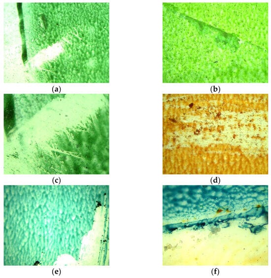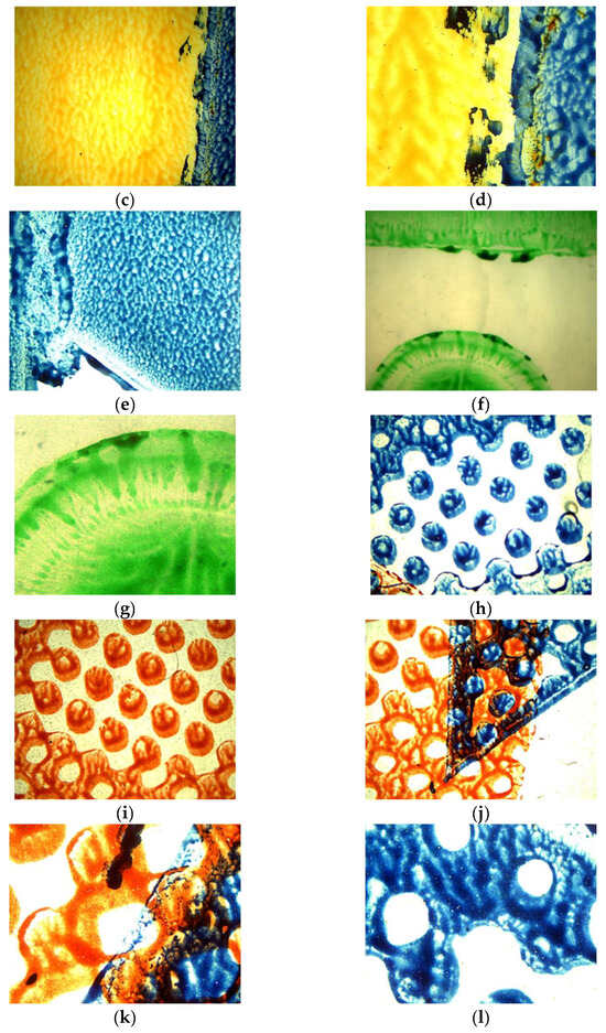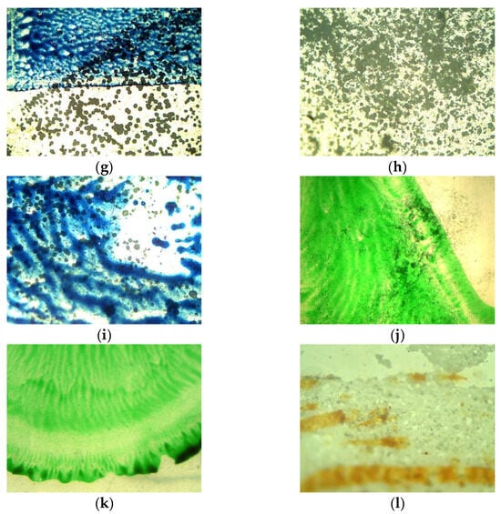 Microscopic photos of selected print samples after 14 weeks of research: (a) 1—AP (4×) (matrix: tap water/lighting: natural); (b) 1—AP (4×) (matrix: tap water/lighting: natural); (c) 1—AP (10×) (matrix: tap water/lighting: natural); (d) 3—D (4×) (matrix: deionised water/lighting: 0 h); (e) 3—D (4×) (matrix: spring water/lighting: 0 h); (f) 3—D (10×) (matrix: spring water/lighting: 0 h); (g) 4—MK (4×) (matrix: tap water/lighting: 0 h); (h) 4—MK (10×) (matrix: tap water/lighting: 0 h); (i) 4—MK (10×) (matrix: tap water/lighting: 0 h); (j) 2—L (4×) (matrix: deionised water/lighting: 0 h); (k) 2—L (10×) (matrix: deionised water/lighting: 0 h); (l) 3—D (4×) (matrix: tap water/lighting: 0 h).