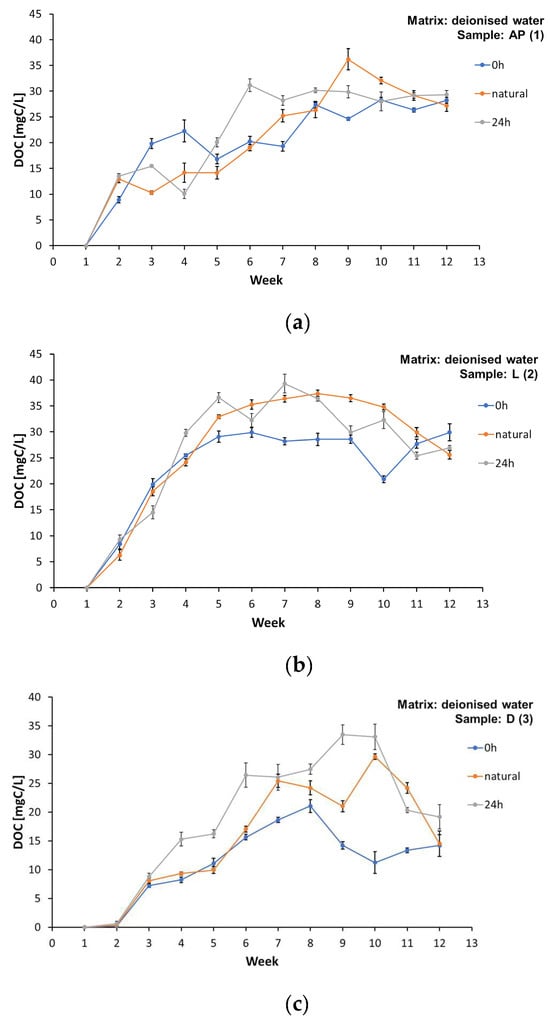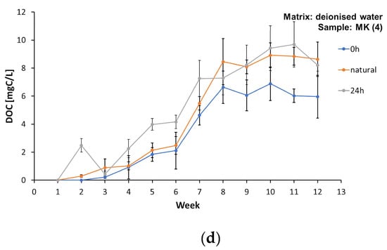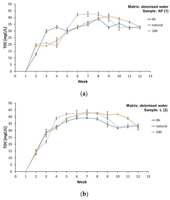 A significant change in total organic carbon concentrations was observed over 12 weeks of total organic carbon measurements in all the samples analysed (Figure 3). Detailed values are presented in Tables S1, S3, S5, and S7 in the Supplementary Materials.