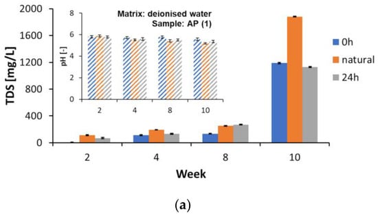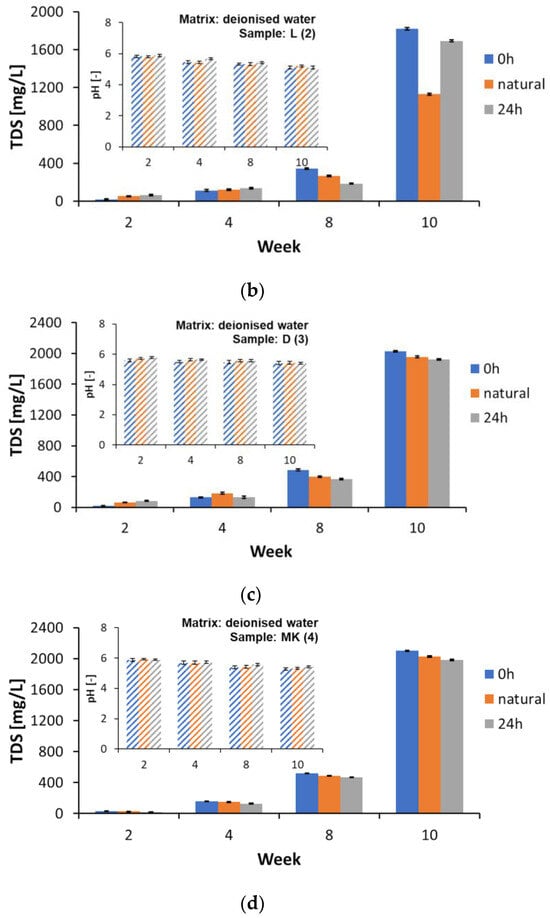 Changes in the reaction (pH) and TDS of the water matrices were monitored periodically during the study’s 2nd, 4th, 8th, and 10th weeks. The matrix samples for the TOC and DOC determinations required preparation and filtration. However, the samples for the TDS determinations were not prepared according to this procedure, as such the results should be treated as additional information only. The changes in the values of the tested parameters in the deionised water matrix are shown in Figure 5 and the other detailed numerical values are shown in the Supplementary Materials, Tables S9 and S10. The pH decreased slightly during the ongoing measurements (Supplementary Materials, Table S10) in all the samples analysed, without any relation to the light intensity, matrix type, or sample type. On the other hand, a strong increase in the TDS values was observed, especially after the 8th week of testing. The TDS concentration in the AP (1), L (2), D (3), and MK (4) samples subject to lighting of 0 h/matrix involving deionised water increased from the 8th to the 10th week (ppm) (Figure 5a–d). Detailed values are presented in Table S9 of the Supplementary Materials. The TDS concentration in the AP (1), L (2), D (3), and MK (4) samples subject to lighting 0 h/matrix involving spring water increased from the 8th to the 10th week (ppm) (all the values are detailed in Table S9 of the Supplementary Materials). The TDS value characterises the inorganic salts present in the water and, partly, the amounts of biological material [], so it can be used as a general parameter to characterise the change in contamination in the aqueous matrices studied.