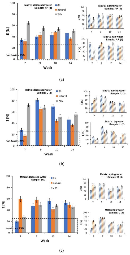 It was determined that the plastic leachate in freshwater causes acute toxicity to Daphnia magna [] and female Acartia tonsa. Whereas toxicity in regard to Nitocra spinipes was observed only after irradiating the plastic samples []. In the conducted experiment, toxic effects were observed for samples AP (1) (Supplementary Materials, Table S15), L (2) (Supplementary Materials, Table S16), and MK (3) (Supplementary Materials, Table S18). In the case of the D (3) samples, a low toxicity of the selected water matrices taken after 14 weeks of testing was noted. This was particularly the case after 24 h of illumination and natural lighting, which shows that a certain amount of the compounds causing the sensitivity of the indicator organisms used may have leached into the water matrices.