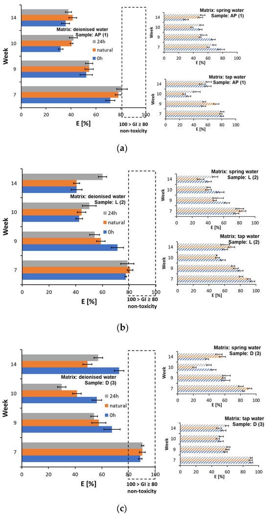 Germination tests taking advantage of Sinapis alba and Lepidium sativum showed a higher sensitivity of the germinated seeds compared to Lemna minor fronds (Supplementary Materials, Tables S12–S14). The root length constitutes a very sensitive parameter, and a number of environmental factors can cause growth inhibition, deformation, or damage []. An initially non-toxic effect of the water matrices on the growth of Sinapis alba root length was observed, in all the analysed cases, during week 7 of the study (Figure 7a–d). Then, the growth inhibition values increased at weeks 9, 10, and 14 of the study, and the analysed water matrices were toxic in regard to the germinating seeds. An increase in root inhibition was also observed in the studies taking advantage of Lepidium sativum, but this did not depend so significantly on the duration of the study. Also in the germination tests, the relationship between the matrix type and lighting conditions and the size of the toxic effect was not confirmed (Figure 7a–d; Supplementary Materials, Tables S12–S14). A visual observation of the deposition of deposits on the surface of the foil samples was carried out, the results of which are shown in selected photos presented in Figure 2g–i,l. The obtained results of the growth inhibition, germination inhibition, or mortality of crustaceans can be related to the increase in the amount of substances washed out from the foil into the water matrix, and, therefore, to the increase in chemical compounds to which the test organisms may be sensitive. Available studies show the effect of leachate in plastics on the growth and development of germinating Lepidium sativum seeds [,]. Among the abnormalities noted, not only was the root length shortened, but also thickened roots, twisted hypocotyls, or distorted and/or extra cotyledons were indicated. Such deformations were also observed in the conducted experiment concerning samples from week 10 and week 14 of the study. Stephan Pflugmacher et al., in 2021, in their study, emphasise that the observed phytotoxic effect decreases along with the prolonged ageing of plastics, which may indicate a reduction in the leaching of toxic substances []. A number of studies are available that confirm the significant toxicity of substances leached out of plastics, for example, involving the use of Daphnia magna crustaceans, Nitocra spinipes invertebrates, and Acartia tonsa, or microalgae [,,,].