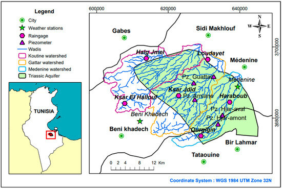 The main watersheds of the studied aquifer are Koutine, Gattar, and Hjar (also called the Médenine watershed). They contain the whole cities of Koutine, Metameur, and Médenine belonging to the governorate of Médenine [46]. The exploitable resources of the aquifer are estimated at 8.7 Mm3/year with an equivalent flow of 276 L/s and the total dissolved solids (TDS) vary between less than 1 g/L and 3 g/L [47].