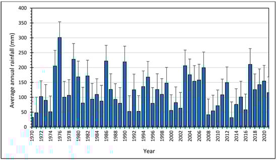 Average annual rainfall observed at all stations with error bars showing one standard deviation in the historical period from 1970 to 2021.
