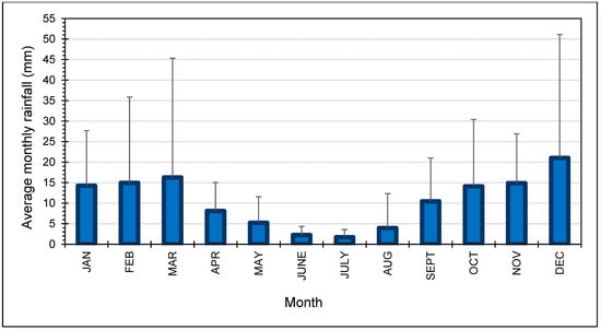 Average monthly rainfall with error bars showing one standard deviation in the historical period from 1970 to 2021.