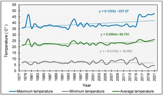 Figure 4 shows the variations in the mean, maximum, and minimum temperatures recorded at the Médenine meteorological station over the period from 1978 to 2021. The average annual temperature of the study area is 23 °C. The maximum temperature recorded is equal to 47.7 °C in 2021 and the minimum temperature is 2.8 °C in 2019. Figure 4 shows that there is a clear trend for an increase in the mean and maximum temperatures and a decrease in minimum temperatures, mainly from the year 2015. Using a linear regression model, the rate of change is defined by the slope of the regression line, which in this case is about 0.133 °C/year and 0.06 °C/year for maximum and mean temperatures, respectively. It is about −0.014 °C/year for minimum temperatures.