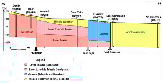 The Triassic sandstone aquifer of Sahel El Ababsa is, in reality, only the free part of a much larger aquifer extending over almost the entire southeast of Tunisia, which is the Triassic sandstone fossil aquifer of Médenine [53]. This aquifer is formed of two sandstone and clay-sandstone levels. It covers the central Djeffara plain, the southwestern part of that of El-Hamada, as well as the entire El Ouara plain [56].