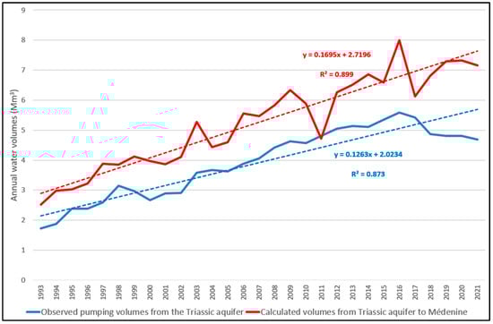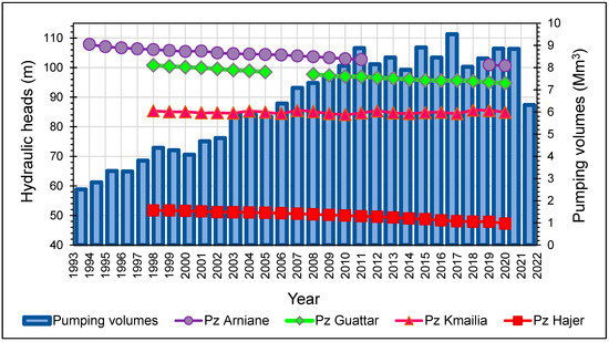 Piezometric history of the Triassic aquifer and pumping volumes [46,57].