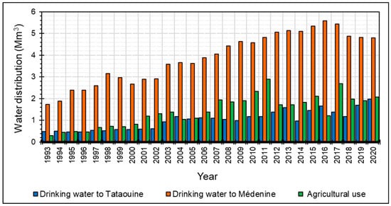 Figure 8 shows the water distribution from the Triassic sandstone aquifer to the cities of Médenine and Tataouine as well as the water distribution to agricultural use.