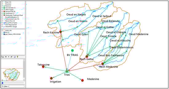 The simulation period for the WEAP M1 project is from 1993 to 2050 with a monthly time step. The choice of the base year 1993 is justified by the availability of observed data. The study area is defined and delimited by the ArcGIS shapefiles in the “Schematic View” interface of the WEAP project. To this schematic view are added the main components necessary to model the Triassic aquifer: the Triassic aquifer is represented by a “Groundwater” node; the studied watersheds are represented by one “Catchment” node; the wadis are digitized by the “River” WEAP component, thus, only the main wadis are added; and finally, the demand site nodes are “MedenineTrias“, “Tataouine“, and “Irrigation“. Figure 9 shows the model structure of the initial Triassic aquifer, as shown in the WEAP schematic view.