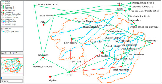 On the other hand, the resulting WEAP project M2, presented in Figure 10, differs from the first one by the consideration of the demands. Model M1 is based on recorded local distribution from the Triassic aquifer, whereas model M2 estimates both demands and supplies for the entire Médenine governorate. In M2, domestic demand sites include “Médenine”, “Tataouine”, “Jerba”, “Zarzis”, and “Ben Guerdane”, representing the main cities of the governorate. The “Other” demand site accounts for small agglomerations, some industries, and ungrouped consumers supplied directly from the main pipelines. Only the cities of Médenine and Tataouine receive drinking water from both the Zeuss Koutine and Triassic aquifers, which are blended in the Tajra2 Tank, as previously mentioned.