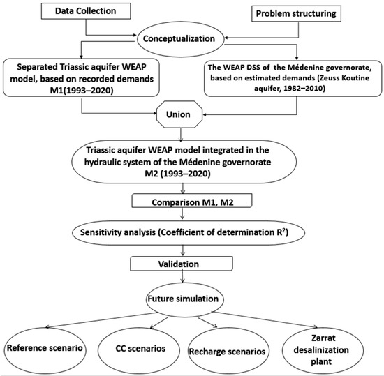 To achieve the present DSS, first, a database of climatic, geologic, hydro-geologic, hydraulic, and management information was created. In the second step, the WEAP software [20,41] was used to develop a conceptual model of the bio-hydro system of the Triassic aquifer using only the observed data for the different supplies and demands, then presenting the studied aquifer separated from the other components of the hydro-system in the region. In the last step, a union was made between the Triassic aquifer model and the developed WEAP DSS established already for the hydro-system of the Médenine governorate by the main author and describing all the water resources contributing to the water supply for the whole governorate [31,32]. The simulation period for the WEAP project is from 1993 to 2020 with a monthly time step. The forecast period is from 2020 to 2050. The reference scenario postulates maintaining the same climatic conditions, socio-economic activities, and WRM conditions as those of 2020.