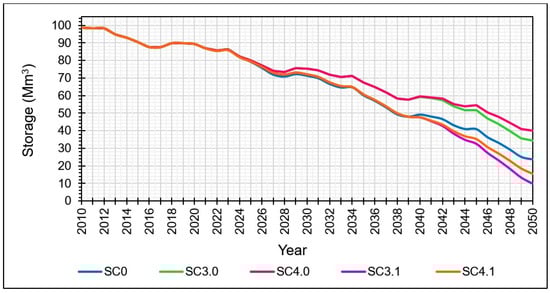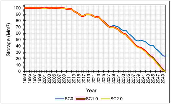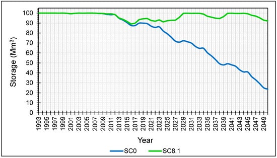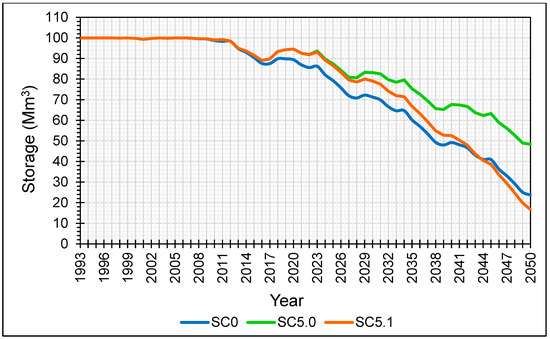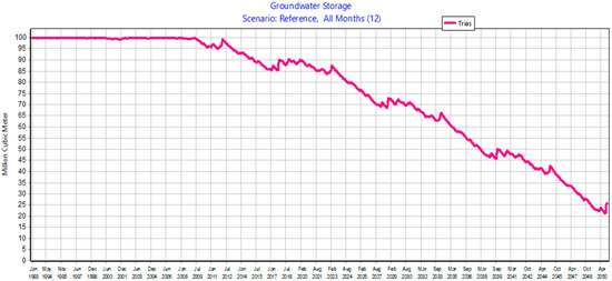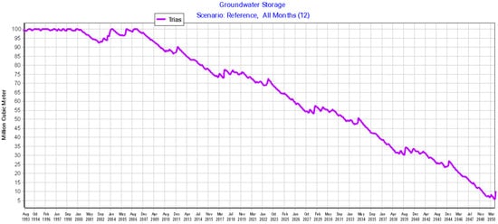 WEAP simulates the aquifer node as a reservoir to which an initial volume “initial storage” and a maximum theoretically accessible volume “storage capacity” must be assigned. The storage parameter of the aquifer is estimated by the responsible services of CRDA per 100 Mm3 with a maximum monthly withdrawal estimated from historical withdrawals equivalent to 0.75 Mm3 [46]. The watersheds of the Triassic sandstone aquifer are represented in this model by one catchment node, to which it is assigned the total surface area of the watersheds feeding the aquifer, equal to 650 km2.