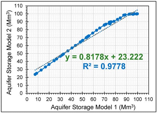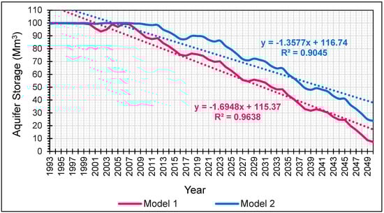 In summary, two WEAP models of the Triassic aquifer were developed. The initial model, M1, includes only the Triassic aquifer, its catchment area, and associated water demands. It is based on observed demands for the simulation period from 1993 to 2020. The final model, M2, integrates the Triassic aquifer within the broader hydraulic system of the Médenine governorate. This integrated model builds upon the previously calibrated and validated Zeuss Koutine aquifer WEAP model developed by the lead author [31,32,64].