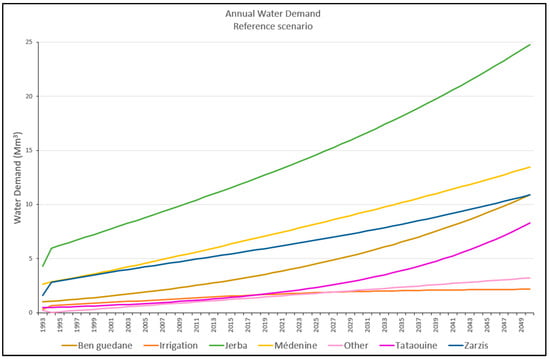 The specific consumption calculation for domestic use in the Jerba and Zarzis demand sites is based on historical water distribution data from SONEDE [57]. However, for touristic use, a growth rate of 0.5% is applied to the value estimated in 1993, which stood at 211 m3 per inhabitant.