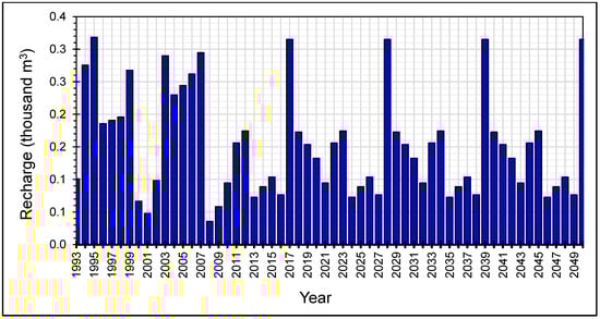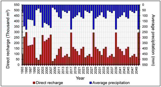 Indeed, the Triassic sandstone aquifer can be fed directly by precipitation according to the adopted hypothesis, setting the direct recharge rate at 2.4% of the average precipitation in the region. This value is inspired by the SASS, Biskra, and Tunisian–Libyan Jeffara models [63] and it has also been used by previous studies [31,32,56,64,65].