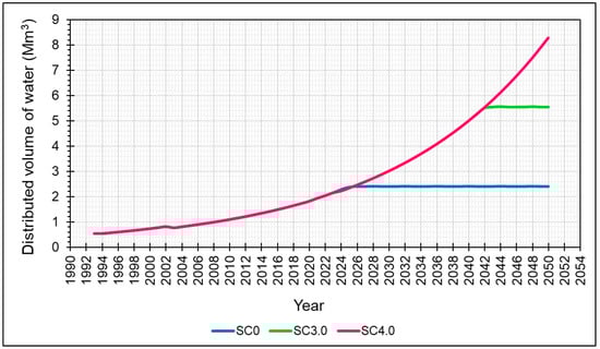 For the demand site nodes “Médenine Trias”, “Tataouine”, and “Irrigation”, the actual recorded distributed volumes are attributed to the simulation period (1993–2020) in this initial WEAP project M1, representing only the Triassic aquifer separately from the other water resources of the Médenine governorate [46,57].