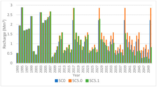 The indirect recharge rate from flood infiltration in the wadi beds was initially estimated at 50% of the runoff volume calculated using the Fersi formula (1). This value is expected to increase over time, given that the Tunisian government launched the first national strategy for water and soil conservation and the mobilization of water resources for the period of 1990–2004. As a result, water harvesting techniques (WHTs) have seen significant development in the study area and in Jeffara in general. The hypothesis of recharge by flood infiltration in the wadi beds was estimated by Mr. Yahyaoui, the former district head of water resources at the CRDA of Médenine, and was used in the previously cited studies [31,32,64].