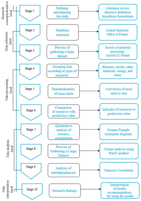 The research presented in the article was conducted in five parts, in several stages. Initially, a review of the papers identified through Scopus, Web of Science, and Google Scholar database and international organization reports was conducted using the PRISMA framework focusing on studies from the last 15 years. In the second part of the study, a database at the meso-level was selected. Gathering such detailed data proved challenging due to its limited availability and the need for purchase, as relatively few industry-level studies are conducted with such a high degree of detail. The third stage involved an extended process of collecting a large dataset. The source data were obtained from the statistics of the Central Statistical Office (Poland). The use of data from 2016 is justified by methodological factors. Data on resource consumption in industry are subject to a lengthy process of verification and aggregation by the Central Statistical Office, due to the comprehensive nature of the collected information and the necessity of their validation. Additionally, the year 2016 pertains to a period of stable economic functioning, prior to the emergence of the coronavirus crisis associated with the global COVID-19 pandemic, which occurred in the years 2020–2022 and significantly impacted the functioning of all economic sectors, followed by the outbreak of the Russian–Ukrainian war. The use of data from this time horizon thus allows for the analysis of standard patterns of resource consumption, unaffected by economic changes resulting from these crises.