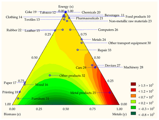 A special cubic function was selected for the analysis, which allows for the representation of nonlinear phenomena. In this case, the efficiency of the use of biomass, metals, and energy in relation to the value of production can be assessed. A cluster of points indicates similar structures of raw material consumption by industrial processing departments. A contour chart shows how variables (biomass, metals, energy) influence production efficiency. A positive coefficient indicates that the given variable increases production efficiency, while a negative coefficient indicates a decrease (according to the legend of the chart). Therefore, a special cubic function can be used to model the relationship between resource size and production value. This function is described by the following Formula (2):