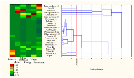Next, a heatmap visualization was used in combination with the Ward method, illustrated in the dendrogram. In this analysis, all available data on the consumption of biomass, metals, other materials, energy, and water were taken into account, and the values of the obtained final output for the 24 industrial processing divisions were considered. Using a heat map for analysis, combined with Ward’s method, can provide accurate information on which departments are similar in terms of the analysed characteristics. The heat map model is used to illustrate (estimate) the main components consumed in production versus the final value for industrial processing departments. The dendrogram presents a hierarchical clustering of industrial departments in terms of the variables analysed. Data for analysis were standardized by Formula (3):