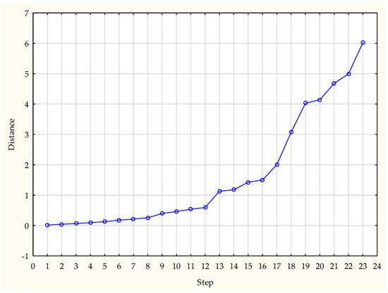 In searching for departments with a similar level of resource utilization and achieved final production value, an agglomerative Ward method analysis was conducted using Euclidean distance, which is the geometric distance in multidimensional space, calculated using Formula (4):