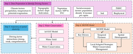 The results of the InVEST WY sub-model, namely WY, were input to calculate WC using a topographic index. Furthermore, the SECTM was used to determine sensitivity and regulation zones based on (1) precipitation, (2) evapotranspiration, and (3) land-use data. Meanwhile, MGWR determines local driving factors (socioeconomic, topography, climate, and vegetation) at various spatial scales. The integration of SECTM and MGWR advances the accuracy of WC strategies by addressing gaps in spatiotemporal dynamics and heterogeneity analysis. The study was conducted in four stages, as shown in Figure 2.