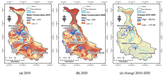 The WC obtained in this study is presented in Figure 3 and Table 2, based on the calculation using Equation (1). This table represents the total amount of WC in different sub-watersheds within the Citarum watershed in 2010 and 2020. The WC patterns in 2010 and 2020 were relatively similar. In 2010, the average WC ranged from 397.42 to 631.22 mm/ha, with the highest levels in the central sub-basin and the lowest in the upstream sub-basin. By 2020, there was a decline in the WC. The average WC in the Citarum watershed from 2010 to 2020 decreased by 11.55%, from 513.96 mm/ha to 453.64 mm/ha. All sub-watersheds experienced a decline in WC from 2010 to 2020. These results were also reflected in a study conducted by [40], in which four catchment areas in the Citarum watershed experienced a decrease in WC between 2010 and 2020. The downstream sub-watershed saw the largest percentage reduction (−13.98%), while the upstream sub-watershed saw the smallest decrease (−6.98%). The overall Citarum watershed experienced an 11.55% reduction in the total WC volume over the decade, reflecting environmental or land-use challenges affecting water retention.