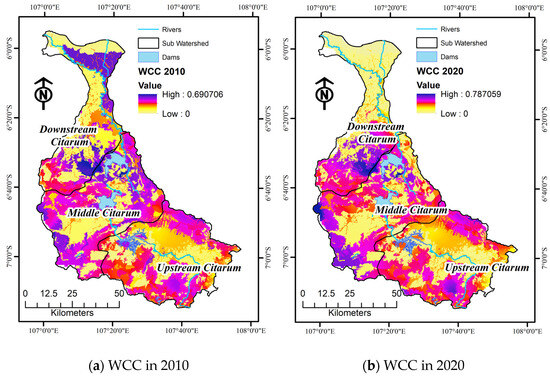 Spatial distribution of WCC in 2010 and 2020 in the Citarum watershed.