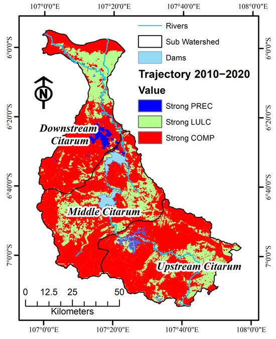 Based on Equations (4) and (5), the grid calculation analysis produced a spatial elastic coefficient trajectory table, which is displayed in Table 4 and illustrated in Figure 5. Table 4 outlines the distribution of land regulated by different regulations, showing that comprehensive and land-use regulations dominate the regulated area. The Citarum watershed study area is divided into 27 codes. This area is primarily characterized by strong comprehensive regulations covering 502,295 ha (72.70%). In addition, there are areas under strong land-use regulation, covering 179,983 ha (26.05%), and areas with strong precipitation regulation status, covering 8636.45 ha (1.25%). Most areas, 502,295.93 ha (72.7%), are under strong COMP regulations, reflecting extensive land use and resource management policies.