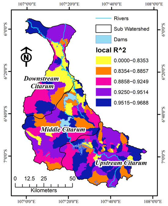 The mean MGWR coefficients for the relationship between WC and its DFs are as follows: socioeconomic (−0.087), topography (0.047), climate (0.002), and vegetation (0.180). Between 2010 and 2020, variations in WC within the Citarum watershed exhibited a negative correlation with socioeconomic factors (Figure 7a). In contrast, WC was positively correlated with topographic (Figure 7b), climatic (Figure 7c), and vegetation factors (Figure 7d). The correlation values highlight spatial variations, as illustrated in Figure 7b. The local R2 values, ranging from 0.50 to 0.95, indicate the explanatory power of the MGWR model. The four key driving factors, namely, socioeconomic, topography, climate, and vegetation, collectively explain 97.7% of the observed variations in WC, as depicted in Figure 7b.
