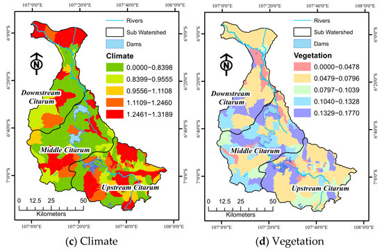 Figure 6 illustrates the relationship between changes in WC and the driving factors in the upstream sub-basin area. A stronger correlation was observed compared to the middle and downstream sub-watershed areas. Conversely, the downstream sub-watershed areas exhibited weaker correlations. The factor detectors were used to rank the relevant factors listed in Table 5 according to their ability to explain the geographic variation in WC change. The influence of different drivers on WC changes can vary. The highest q-values were found for socioeconomic, topography, climate, and vegetation factors at 0.277, 0.496, 0.497, and 0.527, respectively (Table 5). These values underline the role of these three parameters as major contributors to the spatial variation in WC.
