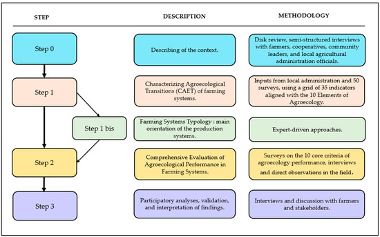 TAPE is a comprehensive analytical framework grounded in the 10 principles of agroecology (Table A1) and closely aligned with the Sustainable Development Goals (SDGs) (Table A2). Particularly, TAPE is a step-by-step approach consisting of three main steps, supported by an initial description of the context and systems (step 0) and including an optional typology (step 1 bis) (Figure 2). The following steps are outlined below.