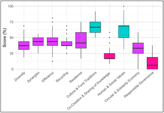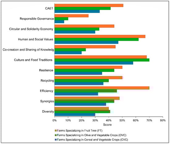 Similarly, the element “efficiency” (0.76, p < 0.001) demonstrates a strong correlation with CAET, indicating that the most efficient farms are those that effectively apply agroecological practices in their daily management (e.g., crop diversity, presence of livestock, crop rotation, intercropping, composting, local varieties and breeds, localized irrigation) [40,41]. The element “resilience” (0.66, p < 0.001) also presents a significant positive correlation, highlighting that farms capable of withstanding various disturbances—whether climatic (e.g., droughts, floods, heatwaves), economic (e.g., high input costs, limited access to agricultural credit, price fluctuations of agricultural products), or ecological (e.g., soil erosion, overexploitation of water)—tend to be in agroecological transition.