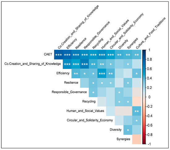 Pearson’s correlation matrix between agroecological elements and their level of CAET (Asterisks indicate levels of statistical significance: *** for p < 0.001, ** for p < 0.01, and * for p < 0.05) (Detailed values can be found in Table S2).