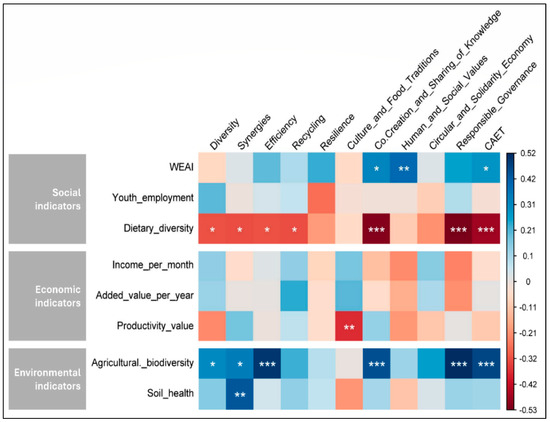 Pearson’s correlation between the level of agroecological transition (CAET) and social, economic and environmental indicators (Asterisks indicate levels of statistical significance: *** for p < 0.001, ** for p < 0.01, and * for p < 0.05) (Detailed values can be found in Table S3).