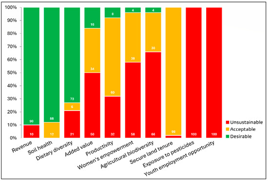 The results show that farms with a higher degree of agroecological transition tend to have greater richness and variation in agricultural biodiversity. However, the majority of the evaluated households (66%) demonstrate an “unsustainable” (red) level of agricultural biodiversity (with a score of 0.5 for this indicator) (Figure 7). Therefore, targeted improvements are essential to encourage more agroecological practices in the Sbikha delegation over the long term.