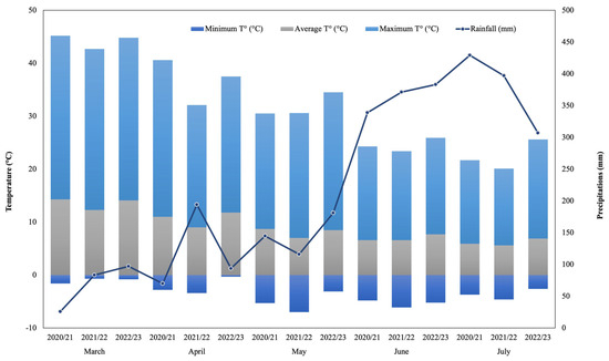 Weather parameters among studied seasons in Freire, La Araucanía region, Chile, which includes the two evaluated localities: Campo Experimental Maquehue (38°50′28.5″ S, 72°41′40.4″ W; altitude: 200 m.a.s.l.) and Radal (39°10′06″ S, 72°19′11″ W; altitude: 168 m.a.s.l.). Data were provided by Agrometeorología INIA (https://agrometeorologia.cl) (accessed on 14 May 2025).
