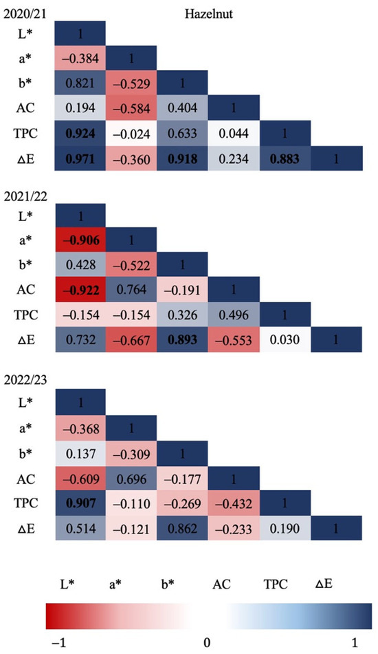 Hazelnut shell: Pearson’s correlation coefficient matrix among seasons and all variables. Correlation was calculated for three productive seasons (2020/21, 2021/22 and 2022/23). Pearson’s coefficients that are significant at p ≤ 0.05 are indicated by bold numbers. Positive and negative correlations are distinguished by blue and red colors, respectively.