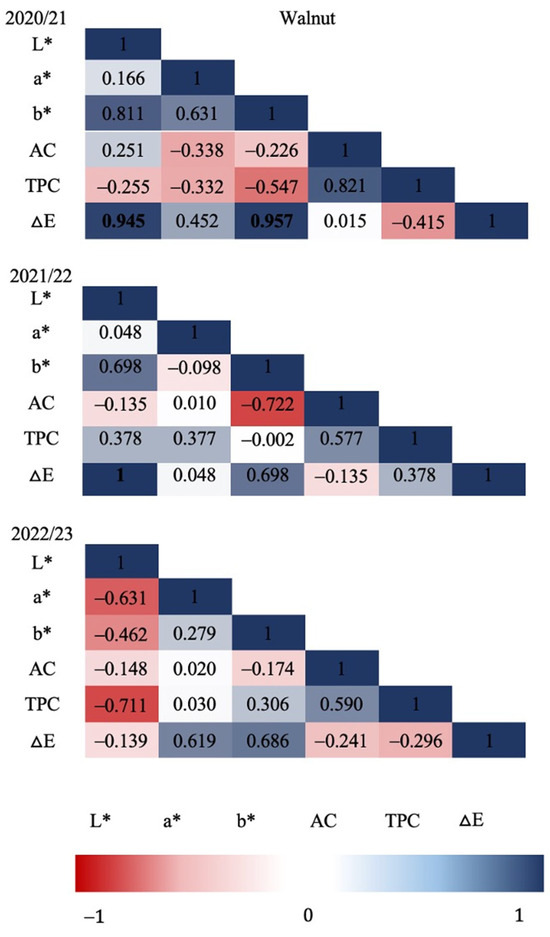 Walnut shell: Pearson’s correlation coefficient matrix among seasons and all variables. Correlation was calculated for three productive seasons (2020/21, 2021/22 and 2022/23). Pearson’s coefficients that are significant at p ≤ 0.05 are indicated by bold numbers. Positive and negative correlations are distinguished by blue and red colors, respectively.