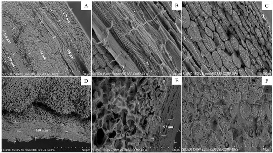 Scanning electron microscopy (VP-SEM) visualization of nutshell profiles (hazelnut (A–C) and walnut (D–F)). Images are zoomed to 500 µm (A,D) and 100 µm (B,C,F). The arrows point to different cell layers in each sample. Analyses were carried out at the Microscopy and Flow Cytometry Unit, BIOREN-UFRO, Universidad de La Frontera, Temuco, Chile.