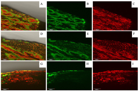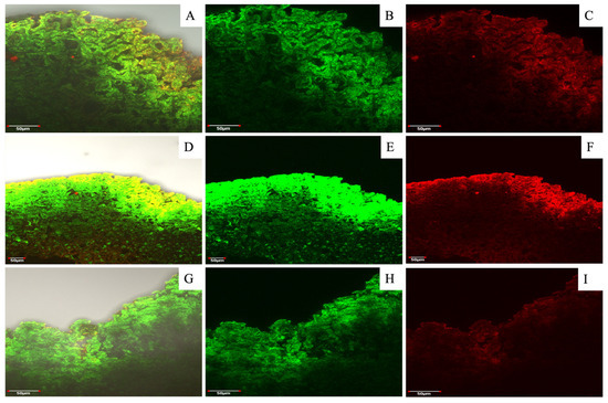 Hazelnut shell profiles after dyeing and fluorescence visualization assay using laser confocal microscopy. Figures (A,D,G) correspond to a MERGE (overlap of both dying solutions) of nutshell profiles in relation to three seasons (2020/21, 2021/22 and 2022/23, respectively); meanwhile, figures (B,C,E,F,H,I) correspond to the same picture with separate dyeing. All figures are zoomed in to 50 µm. The staining solutions used were “red congo” (red) for cellulose and “safranin” (green) for lignin. Analyses were carried out at the Microscopy and Flow Cytometry Unit, BIOREN-UFRO, Universidad de La Frontera.