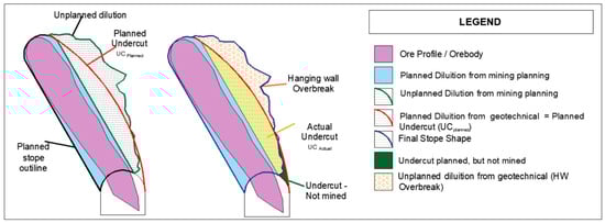In this context, the term “undercut” refers to rock detachment beyond planned limits but whose removal was expected based on stability analysis. Additional displacement exceeding planned limits is termed “overbreak,” as illustrated in Figure 4. This terminology was adopted to simplify understanding dilution calculations in the mine’s operational routine.