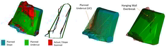 Therefore, ELOS provides a simple method to represent volumetric breakage. It converts overbreak, which can occur at varying depths along the stope surface, into a uniform average depth equally distributed along the entire stope face []. This method facilitates comparison among stopes and identifies stability and dilution patterns. Calculations are used to derive measures such as the average percentage of overbreak or underbreak per stope or total undercut (UC) [].