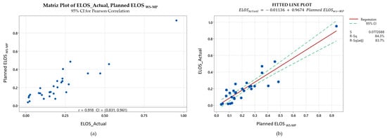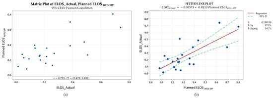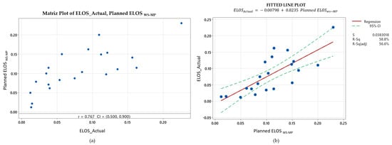 The group of supposedly self-supported stopes occupies an intermediate position. Although the empirical graph classifies them as stable without reinforcement, their field behavior resembles that of lightly supported excavations. When the planned ELOS with support is used as the predictor, the correlation reaches 0.767 and the adjusted R2 about 0.57, while the standard error tightens to 0.04 m (Figure 7). This finding echoes earlier observations by Stewart and Forsyth [] that Zone 1 of the Potvin chart can be optimistic in weaker lithologies: hanging-wall break is still largely controlled by local discontinuities even where empirical criteria suggest stability.