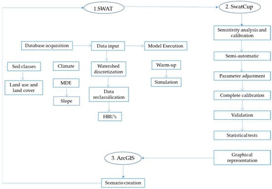 The steps for running the model are presented in the methodological flowchart, which consists of the following seven different stages (Figure 1): acquisition of the database; data input into ArcSWAT; execution of the data to perform the model simulation; sensitivity analysis, which is processed in SwatCup; calibration and validation of the hydrological model, both also processed in SwatCup; and finally, the creation of scenarios with different land use and land cover, which will be performed in ArcGIS.