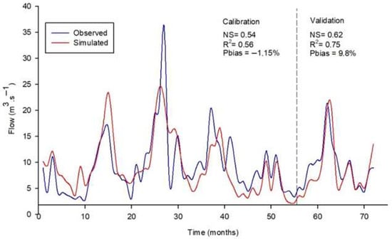 In a study aimed at supporting water resource management and ecosystem services in the Piracicaba River Basin, ref. [32] found NS coefficients ranging from 0.72 to 0.89 during calibration and from 0.50 to 0.75 during validation for monthly streamflow simulation—again classifying the model performance as satisfactory to very good.