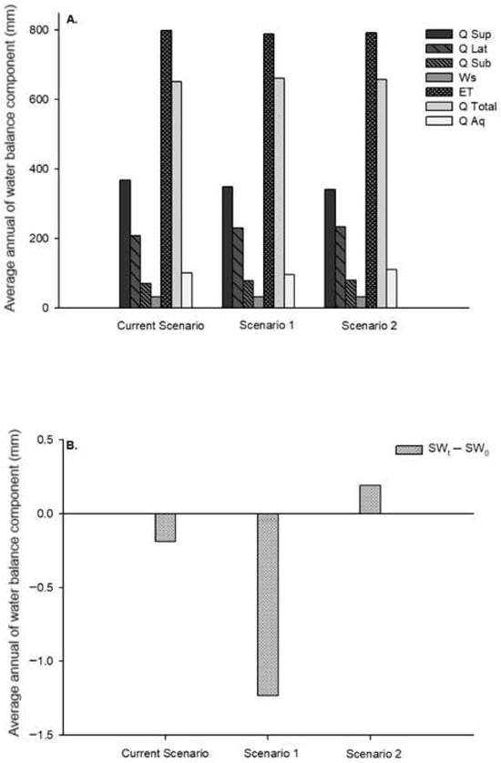 (A) Annual average of water balance components: surface runoff (QSup), lateral flow (QLat), subsurface flow (QSub), total water in the unsaturated soil zone (Ws), water yield (QTotal), evapotranspiration (ET), and total aquifer recharge (QAq) for the Current, Scenario 1, and Scenario 2. (B) Variation in soil water content (SWt-SWo) for the Current, Scenario 1, and Scenario 2.