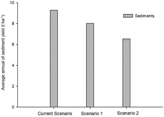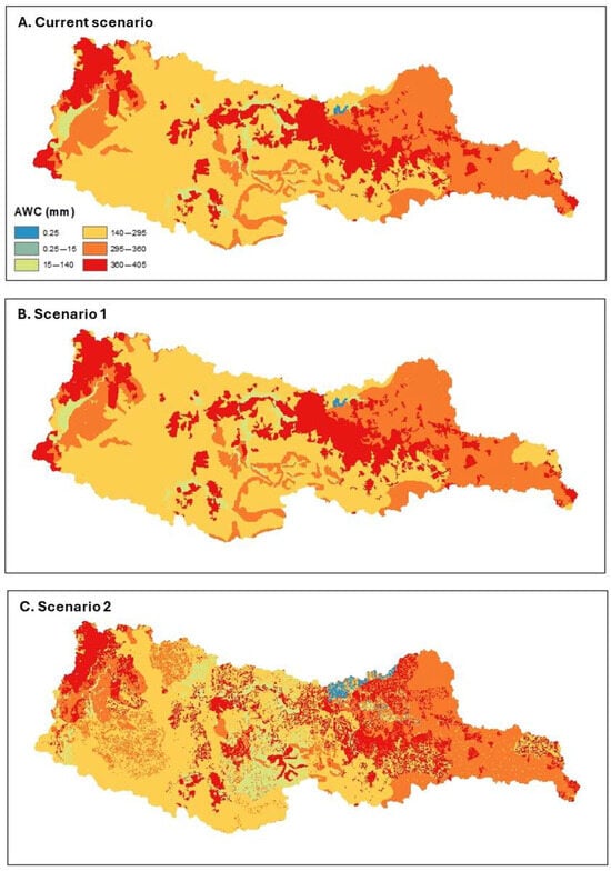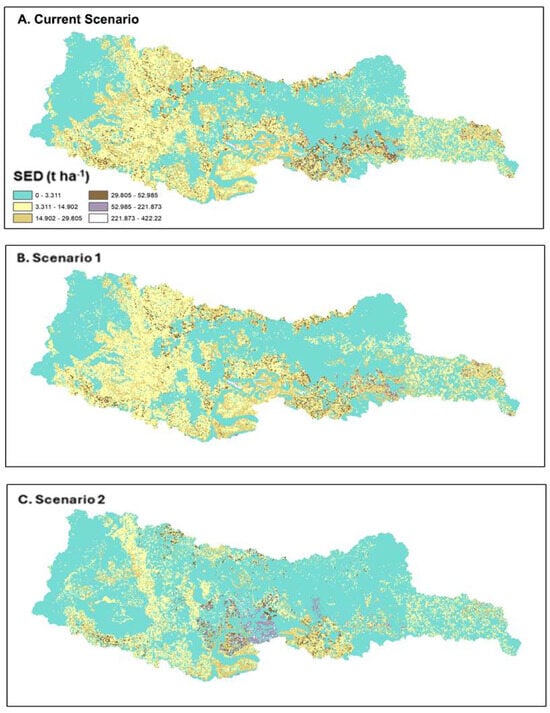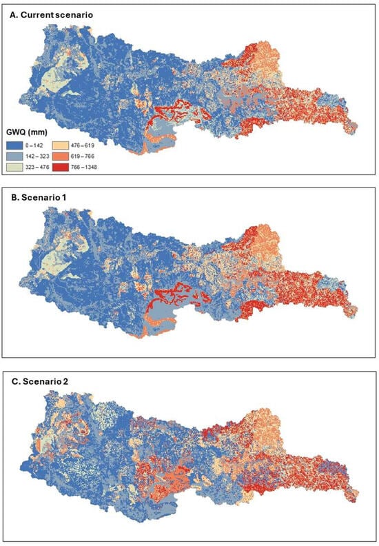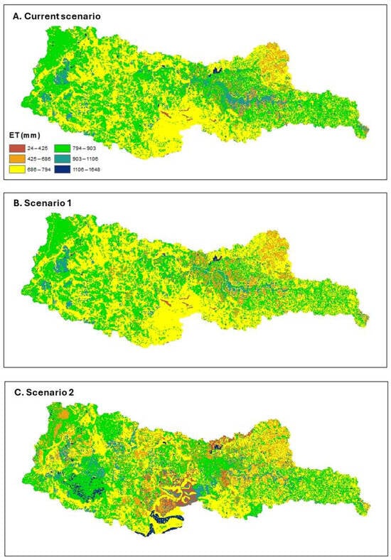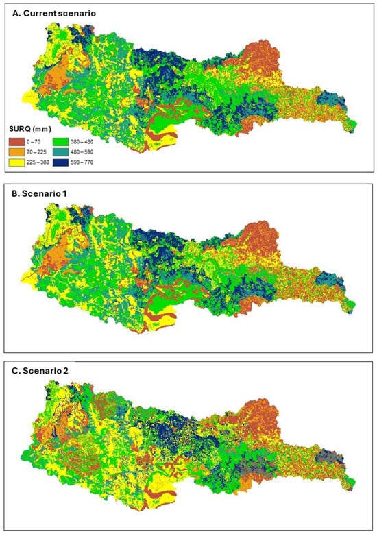 Hydrological balance variables simulated with SWAT for each scenario are presented in the bar charts in Figure 5A,B. Surface runoff (Qsup) decreases in Scenario 1 (348.16 mm) and Scenario 2 (340.13 mm) compared to the Current Scenario (367.64 mm). This reduction results from greater forest coverage, which promotes increased infiltration.