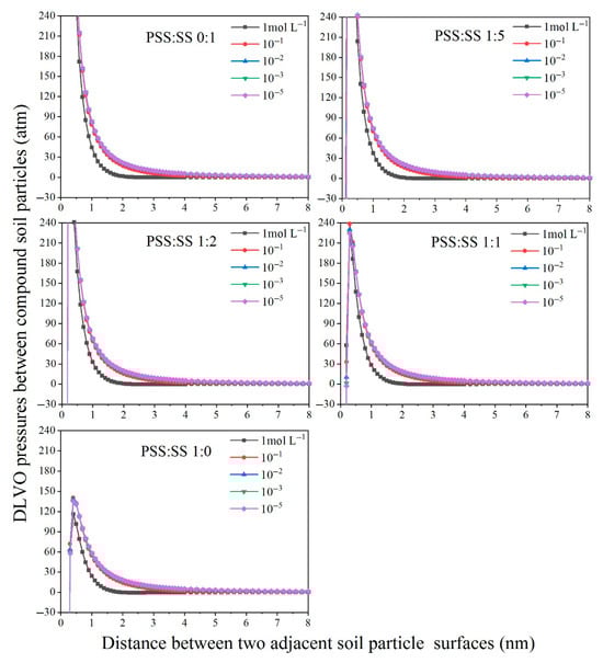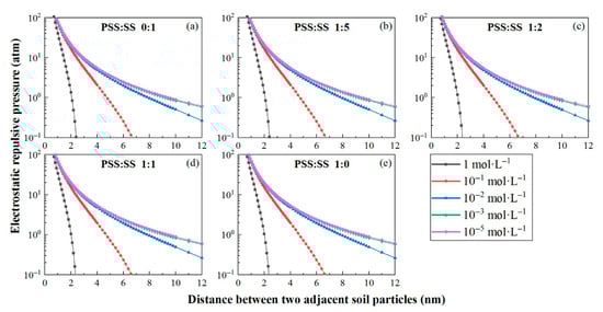According to the Equation (7), Figure 2 presents the electrostatic repulsive pressure distribution between adjacent particles across five soft rock amendment ratios (Figure 2). The electrostatic repulsive pressure decreased with the increase in the distance between adjacent particles and the electrolyte concentration of the soil solution. When the electrolyte concentration in the bulk solution decreased from 1 to 10−2 mol L−1, the electrostatic repulsive pressure increased greatly but remained essentially constant across the 10−2 to 10−5 mol·L−1 range. For example, at a 2.4 mm interparticle distance in 1:1 soft rock-amended sandy soil, the electrostatic repulsive pressure surged from 0.05 to 13.49 atm as bulk electrolyte concentration decreased from 1 to 10−2 mol·L−1. By contrast, further dilution of bulk electrolyte concentration from 10−2 to 10−5 mol·L−1 yielded merely a 0.45 atm increase in electrostatic repulsive pressure (13.49 to 13.94 atm). Similar patterns were consistently observed across other composite soil types, confirming that a concentration of 10−2 mol L−1 represents the threshold value governing the electrostatic repulsive forces between soil particles.